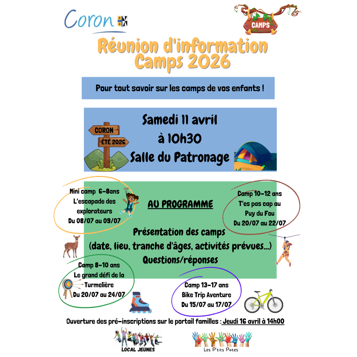 Les équipes Enfance/Jeunesse vous invitent à une réunion d’information dédiée à la présentation des camps 2026. Ce temps d’échange permettra de découvrir les séjours proposés, les modalités d’inscription ainsi que l’organisation générale, et de répondre à toutes vos questions.