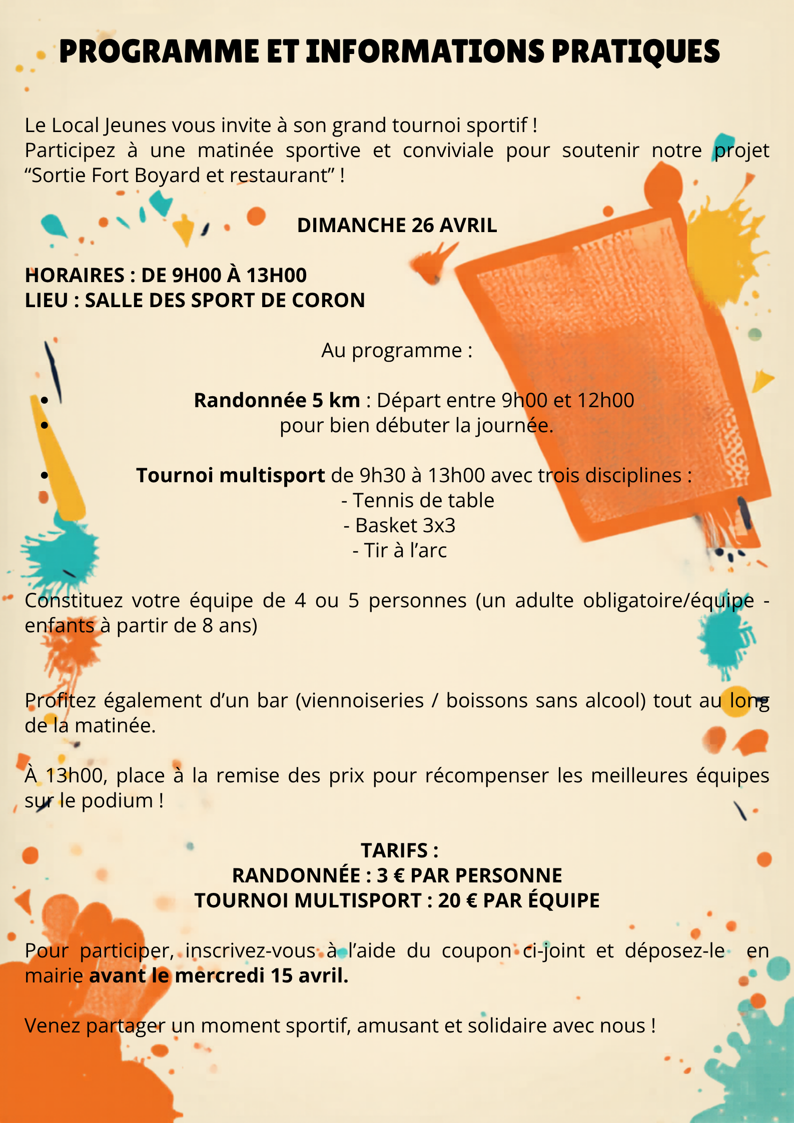 👉 Constituez votre équipe de 4 à 5 joueurs et choisissez de participer au tournoi sportif : tir à l’arc, basket, tennis de table.